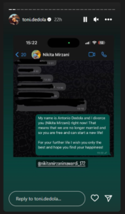 “Namaku Antonio Dedola dan aku menceraikanmu (Nikita Mirzani) sekarang. Itu berarti kita sudah tidak dalam ikatan pernikahan sehingga kamu bebas dan bisa memulai hidup baru. Untuk kedepannya, aku mengharapkan yang terbaik untukmu dan berharap kamu menemukan kebahagiaan,” pesannya pada Nikita Mirzani via WhatsApp.
