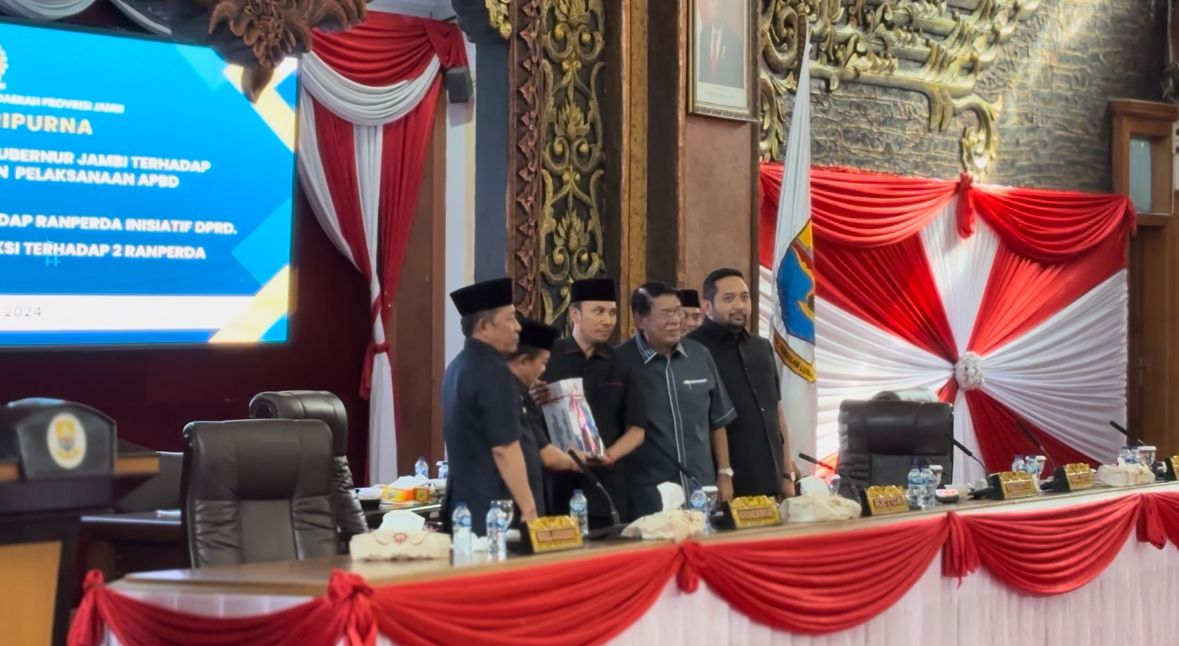 Selectaja.com – DPRD Provinsi Jambi menggelar rapat paripurna dengan tiga agenda pembahasan yakni penyampaian nota pengantar Gubernur Jambi terhadap Ranperda pertanggungjawaban pelaksanaan APBD Provinsi Jambi Tahun Anggaran 2023. Penjelasan pimpinan DPRD terhadap Ranperda Inisiatif DPRD serta Pemandangan Umum Fraksi-fraksi terhadap dua Ranperda, Jumat (5/6) di Ruang Rapat Paripurna DPRD Provinsi Jambi.
