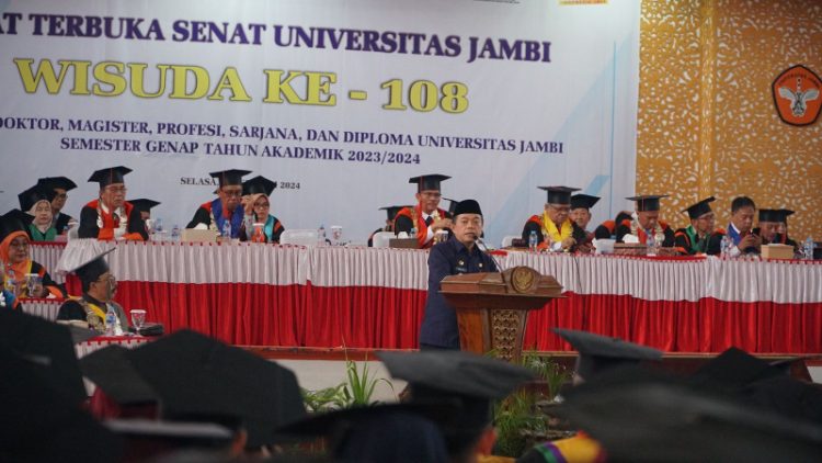 selectaja.com – Gubernur Jambi Al Haris menghadiri Rapat Terbuka Senat Universitas Jambi Wisuda Ke-108 Program Doktor, Magister, Profesi, Sarjana, dan Diploma Universitas Jambi Semester Genap Tahun Akademik 2023/2024 di Balairung Universitas Jambi, Mendalo Darat Kecamatan Jambi Luar Kota, Kabupaten Muarojambi, Selasa (27/2).