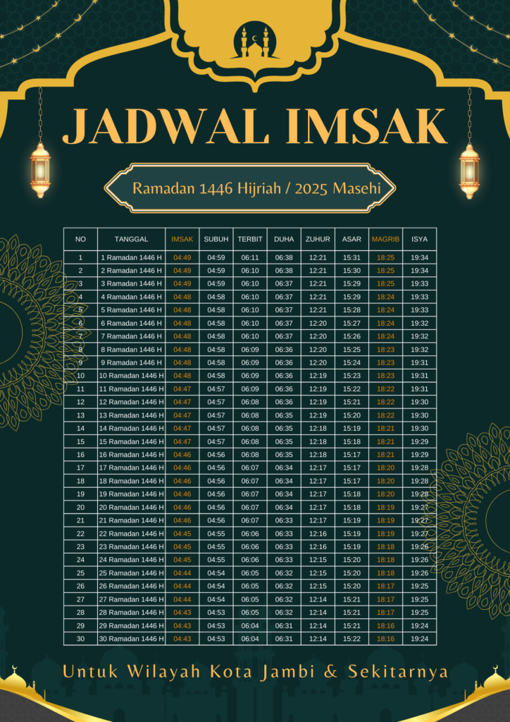 Agar tidak ketinggalan waktu sahur maupun berbuka, masyarakat Kota Jambi dapat melihat jadwal imsakiyah Ramadhan 2025 yang telah disusun oleh Kemenag. Dengan adanya jadwal ini, diharapkan umat Muslim dapat lebih disiplin dan khusyuk dalam menjalankan ibadah puasa.