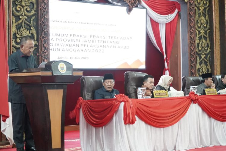 Dalam Rapat Paripurna ini, masing-masing Fraksi di DPRD Provinsi Jambi tersebut menyampaikan Pemandangan Umum dari Fraksi-Fraksi terhadap Rancangan Peraturan Daerah (Ranperda) tentang Pertanggungjawaban Pelaksanaan APBD Provinsi Jambi Tahun Anggaran 2022.